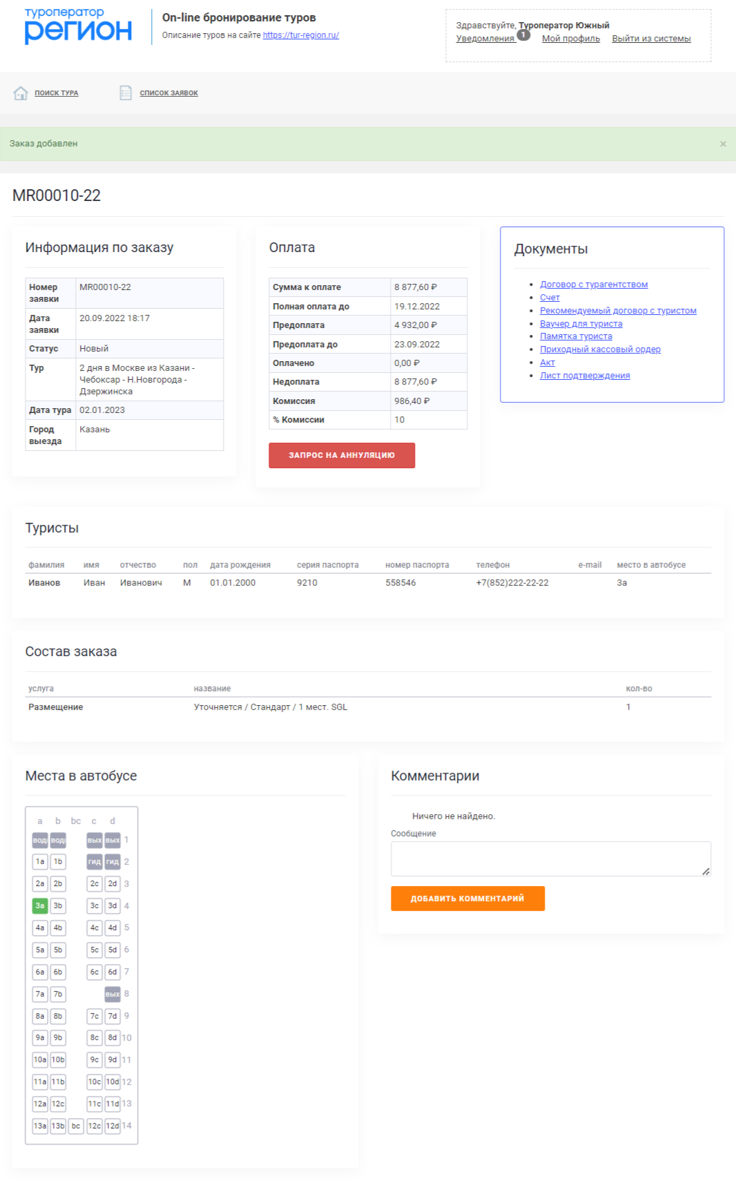 Если все было введено верно, то нас перенаправляет в саму заявку, где у нас отображаются все данные по туру и данные по оплатам, там же вы можете скачать необходимые документы