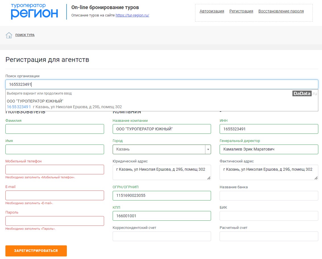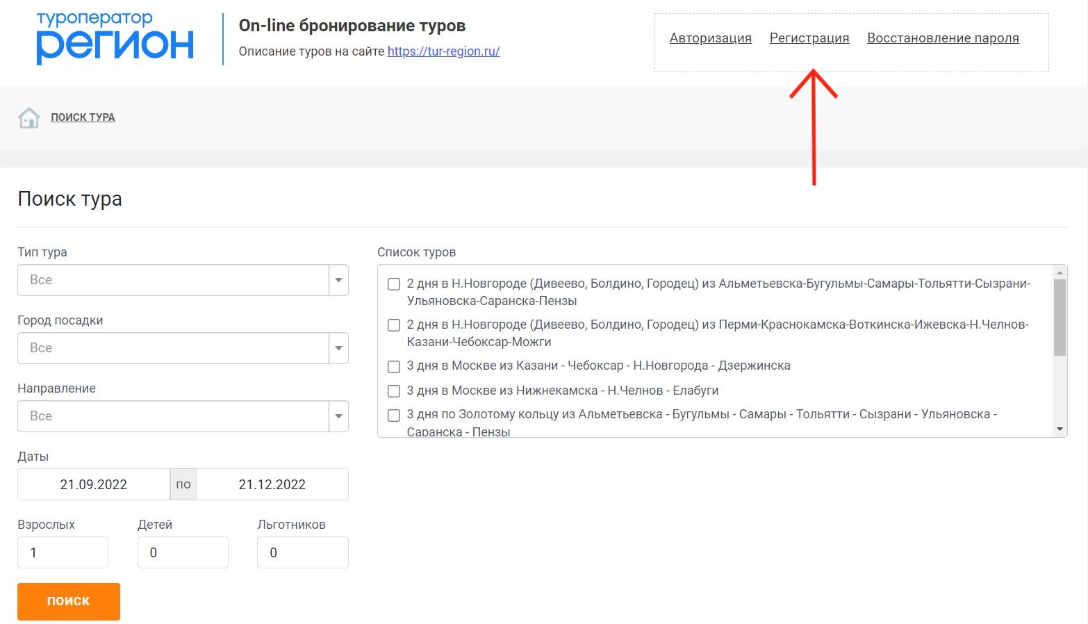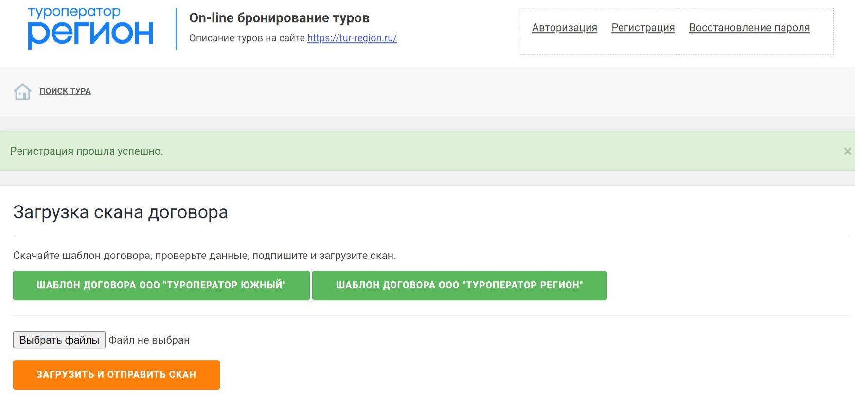 Для начала нам нужно пройти регистрацию и заключить договор с Туроператором, для этого нажмите на кнопку Регистрация